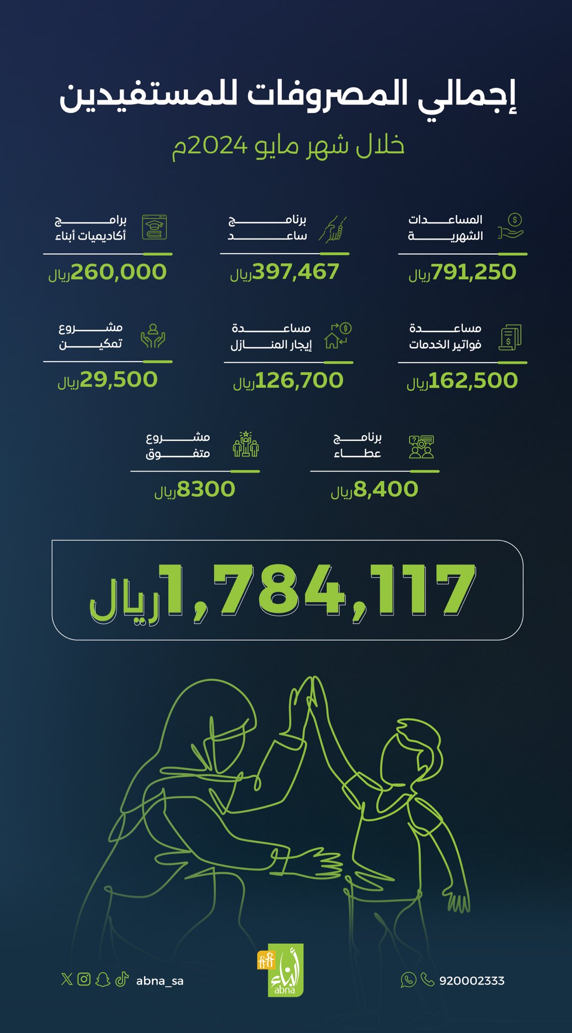 غراسكم أثمر.. وعطاؤكم وصل إليكم إجمالي مصروفات شهر مايو 2024م للمستفيدين التي بلغت 1,784,117 ريال. تقبل الله عطاءكم وإحسانكم.